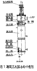 物料由設(shè)在分離筒身下端的入口切向進(jìn)入蒸發(fā)器,并經(jīng)安裝在分離筒身內(nèi)的布料器被連續(xù)均勻地分布于蒸發(fā)筒身內(nèi)壁,從蒸發(fā)筒身蒸發(fā)出的二次蒸汽上升至分離筒,經(jīng)安裝在內(nèi)的氣液分離器,將二次蒸汽可能挾帶的液滴或泡沫分離,二次蒸汽從上端的出口引出蒸發(fā)器。